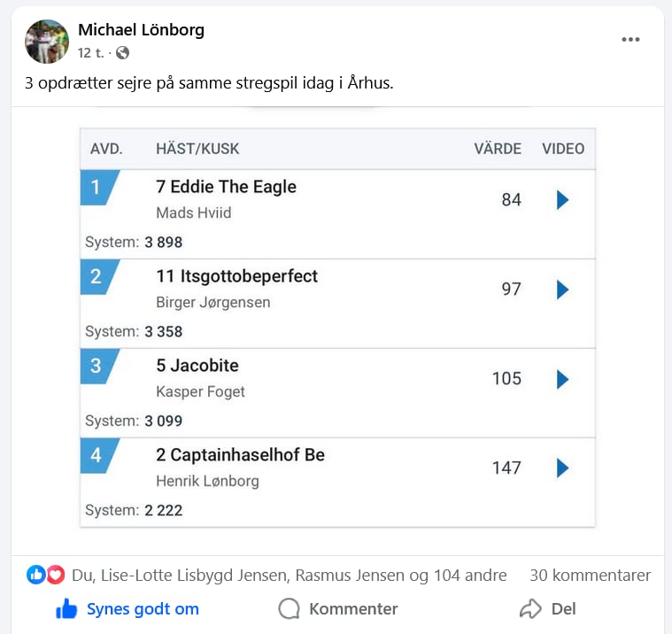 07-03-2026 08:25:11Indrømmet - Trav24.dk blev først opmærksomme på en sjov vinkel på løbene i Aarhus, da vi så et opslag fra den midlertidigt suspenderede travtræner Michael Lønborg på facebook.