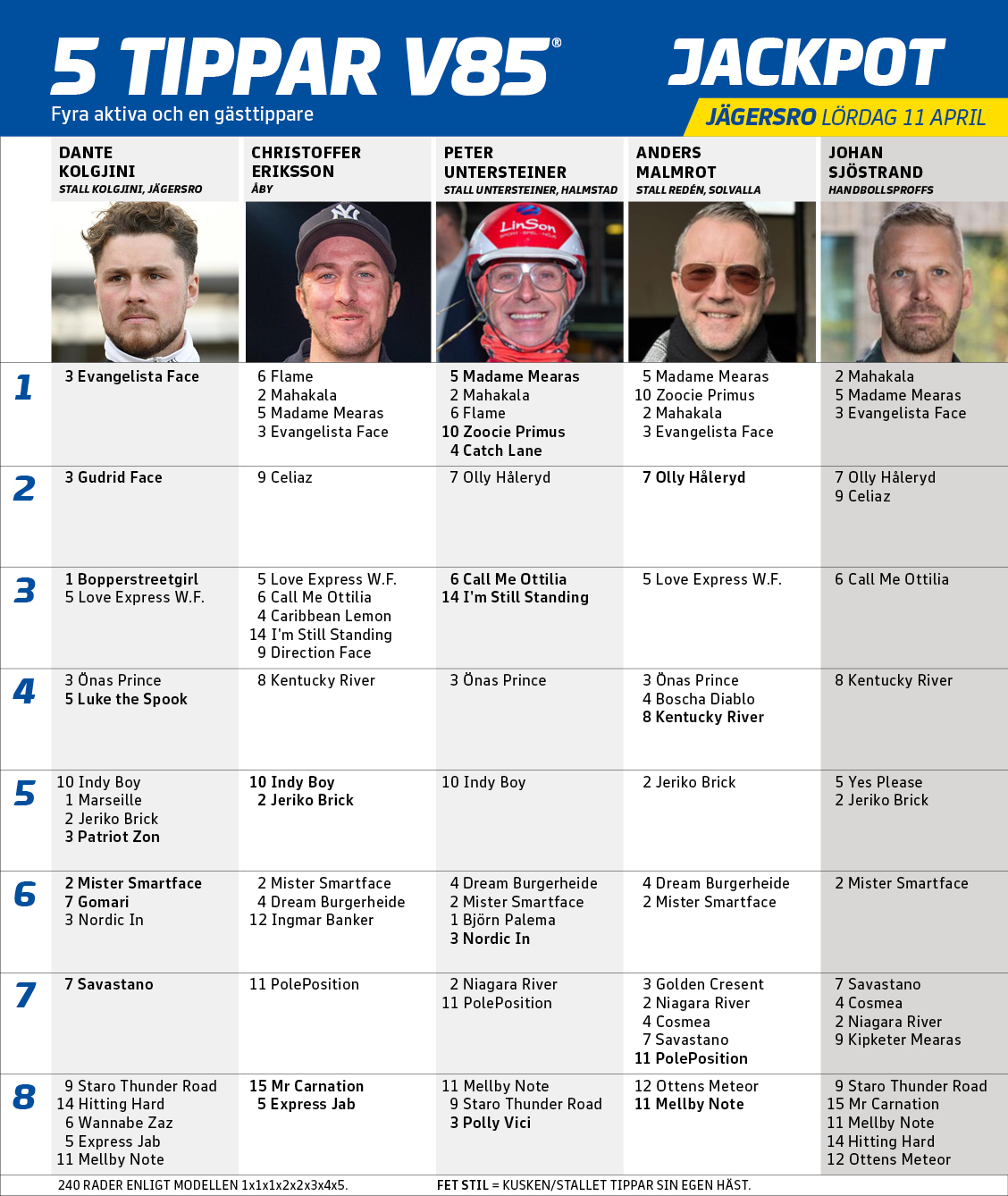 Det sker nemlig i Kanal75's fine oversigt "5 tippar V85", hvor Dante Kolgjini (Stald Adrian Kolgjini), Christoffer Eriksson, Peter Untersteiner (Stald Johan Untersteiner), Anders Malmrot (Stald Daniel Redén) repræsenterer de aktive, mens håndboldstjernen Johan Sjöstrand også kommer med sine bud på de otte rigtige.