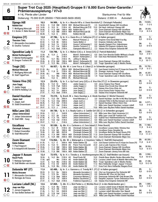 Og mon ikke medejer Søren Aaen, dennes søn Asbjørn og et mindre entourage tager med til Tyskland. Startlisten kan ses herunder. Super Trot Cup køres kl. 14.43.