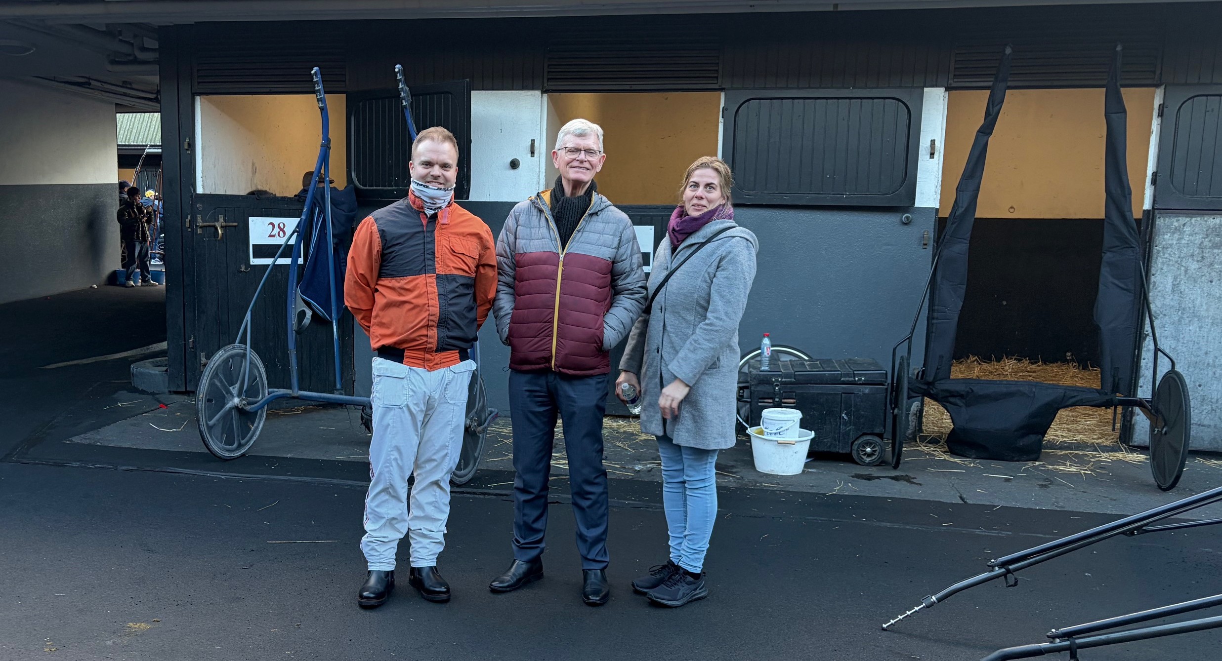 Søren Demant Andersen på staldterrænet på Vincennes sammen med DTC-formand Egon Jensen og Sørens kæreste Michala. Foto: Peter Stenå