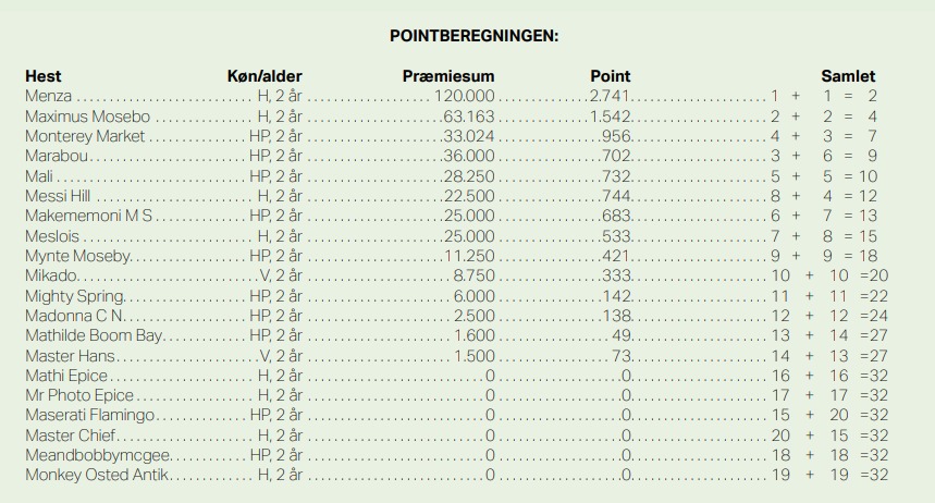 Det var dog også en overkommelig opgave med blot 20 heste tilmeldt. I 2-årsløbene kører hopperne altid automatisk mod hingstene, og Gordon Dahl-trænede Menza topper naturligvis listen, som bringes i sin helhed herunder.