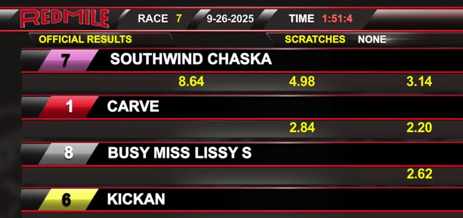 Busy Miss Lissy blev tredje på sin forrygende speed i tiden 1.10,1a/1609m, men der var et stykke frem til Southwind Chaska og Carve, som begge gik 1.09,5.